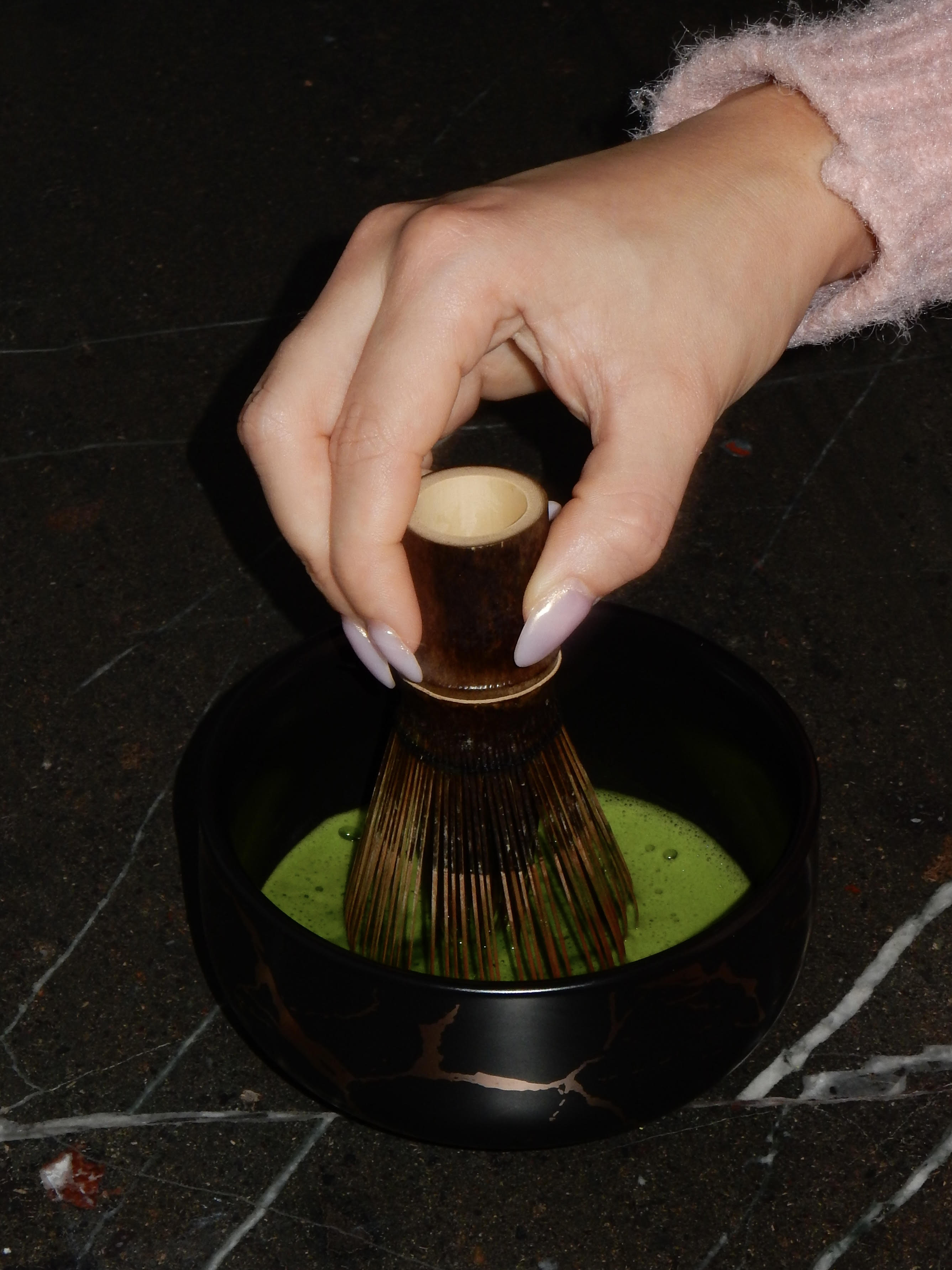 Klop de matcha met een matcha whisk (chasen) ongeveer 15 seconden stevig op in een zigzagbeweging ("M" of "W"), totdat er een mooie, luchtige schuim ontstaat.